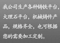全意鑄鐵平臺平板廠家專注生產(chǎn)T型槽鑄鐵平臺,大理石氣浮實(shí)驗(yàn)石平臺,han接鑄鐵平臺,裝配鑄鐵平臺,檢測測量大理石平臺,試驗(yàn)鑄鐵平臺,測量大理石平板,T型槽平臺,電機(jī)試驗(yàn)平臺,三坐標(biāo)測量平臺等鑄鐵平板來圖加工定做業(yè)務(wù),以合理的價(jià)格,專注的技術(shù)服務(wù)于國內(nèi)外客戶,互利合作,共同發(fā)展!公司位于河北交河開發(fā)區(qū),京滬鐵路、104國道、106國道、京福高速公路橫穿而過,與我國的兩大直轄市北京、天津近在咫尺,地理位置優(yōu)越,交通非常便利。我公司本著以誠納客”“嚴(yán)把質(zhì)量關(guān)”“價(jià)格優(yōu)惠”“用戶至上的原則,幾十年兢兢業(yè)業(yè),受到用戶的一致好評!